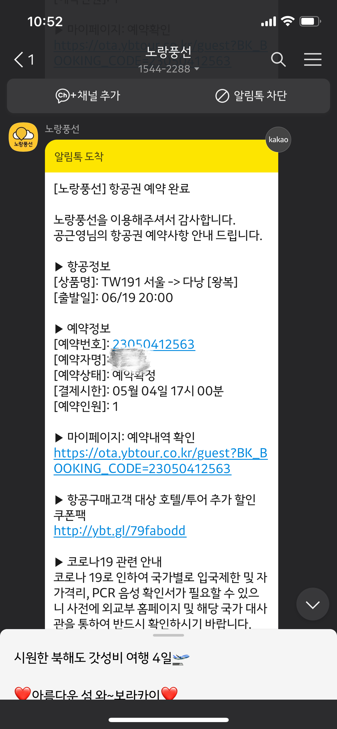 스카이 스캐너에서 검색후 노랑풍선으로 결제 완료!