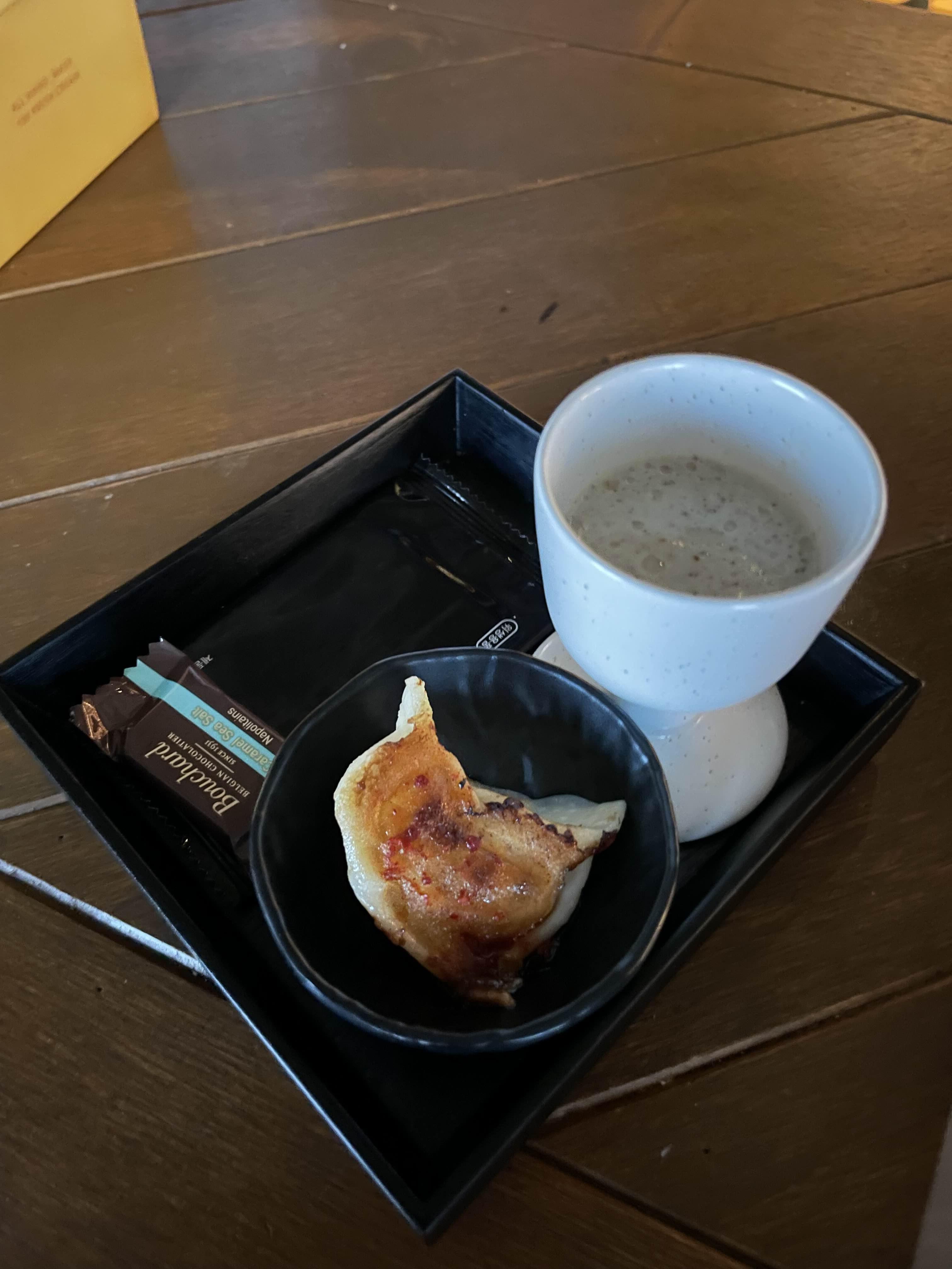 작게 음식을 준다. 트러플 스프와 산동만두, 초콜릿이 나온다. 원래는 타르트를 준다는데 이번엔 산동만두를 주셨다. 일차를 너무 배부르게 먹어서 나오자마자 만두를 먹을수가 없었다.